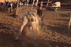 大哥在牛圈赶牛,被牛突然顶到柱子上!!