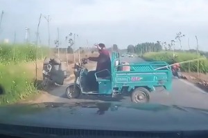 男子开车在乡间小道上行驶,前方大妈突然调头险些撞上!!