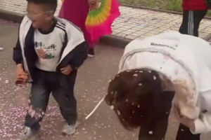 妈妈拍照,儿子在一旁撒花,不料儿子偷偷在瓶子里装满了土…