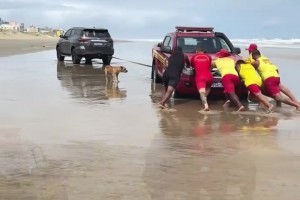 车辆陷进沙滩,众人合力推车,结果狗子跟着节奏开始一起点头…